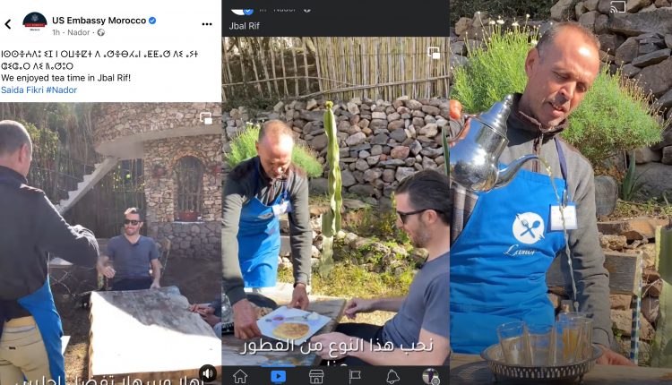 وعلقت السفارة على الفيديو باللغتين الأمازيغية والإنجليزية بالقول : “استمتعنا بالشاي في جبال الريف”.