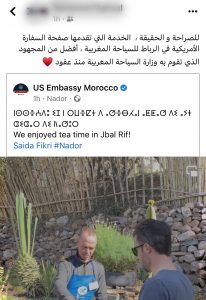 وعلق نشطاء مواقع التواصل الاجتماعي أن السفارة الامريكية، تسوق لوجهة الحسيمة السياحية أفضل من المؤسسات التي يفترض بها إن تقوم بهذا الدور، كمنوبية السياحية والجماعة والمجلس الاقليمي والمجلس الجهوي للسياحة .