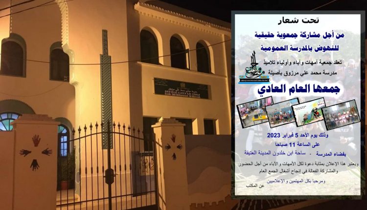 تعقد جمعية أمهات وآباء وأولياء تلاميذ مدرسة محمد علي مرزوق جمعها العام العادي يوم الأحد 05 فبراير 2023 على الساعة الحادية عشرة 11:00 صباحا بفضاء المدرسة الكائن بساحة ابن خلدون – المدينة العتيقة – أصيلة .