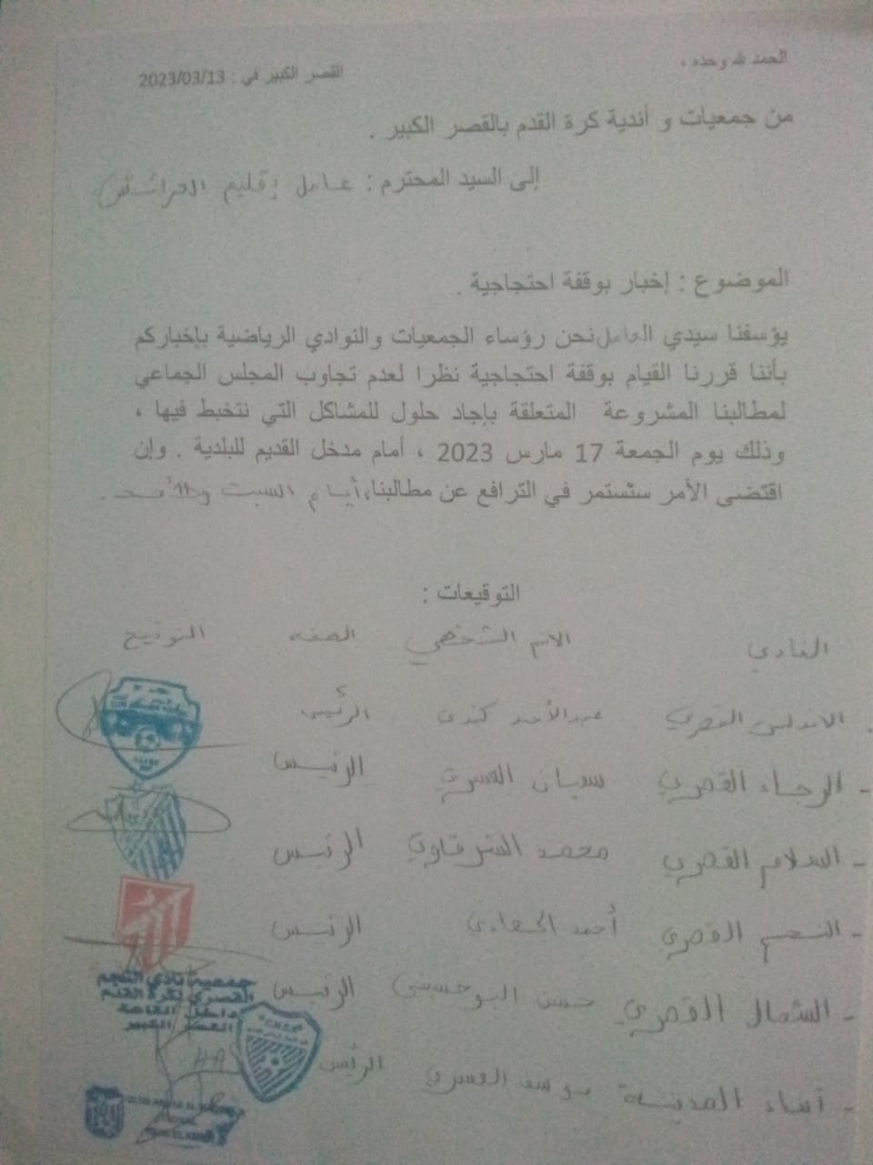 مجموعة من الأندية والنوادي الرياضية سبق وأن راسلت مجموعة من الجهات، من أجل التدخل العاجل وإنصافها من الظلم الذي تتعرض له منذ وقت ليس بقريب، جراء سوء تدبير المجلس الجماعي لملف المنح الرياضية وملاعب القرب والظلم والإقصاء الذي تتعرض له، ونذكر هنا، نادي الرجاء الرياضي القصري لكرة القدم، ونادي الاندلس القصري لكرة القدم، ونادي النجم القصري لكرة القدم، نادي أبناء المدينة لكرة القدم، نادي الشمال القصري لكرة القدم، وأخيرانادي السلام القصري لكرة القدم.