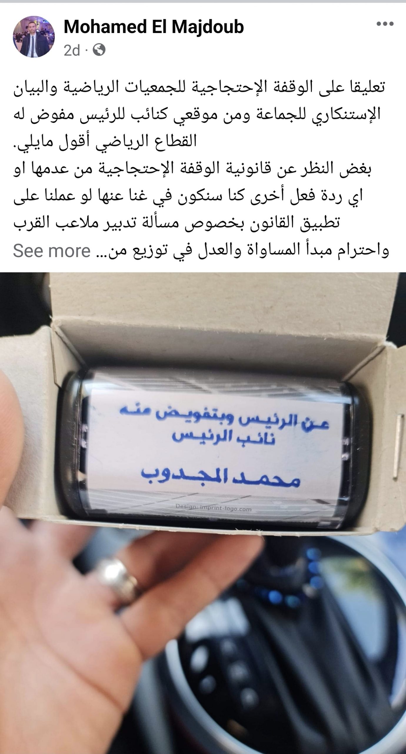 وفي نفس السياق وتعليقا منه على الوقفة الإحتجاجية للجمعيات الرياضية والبيان الإستنكاري للجماعة، أكد السيد محمد المجدوب بصفته نائبا للرئيس مفوض له القطاع الرياضي في تدوينة له على حسابه الشخصي، أنه سبق وحذر في اجتماعات رسمية بالجماعة من التلاعب في مسالة تدبير ملاعب القرب وضرورة احترام مبدأ المساواة والعدل في ما يخص توزيع منح الدعم للفرق الرياضية، مضيفا أنه لم يجد آذان صاغية وقوبل بجواب مستفز يعبر عن قمة التغول حسب تعبيره ؛”الملاعب ديالي أنا جيبتوم نعطيهوم لمن ما بغيت ونقي بهوم السياسة”، وكأن باقي مكونات المجلس مجرد بيادق يقتصر دورها على التصويت في الدورات.