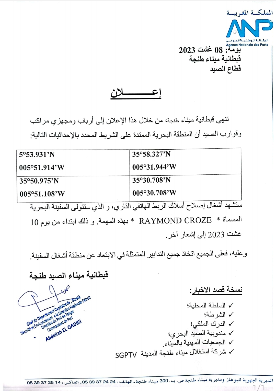 ودعت مندوبية الصيد البحري بطنجة في إعلانها الموجه إلى كافة مهنيي الصيد البحري، الأطقم البحرية إلى الابتعاد عن مواقع تواجد السفينة المذكورة ، وذلك وفق الاحداثيات التالية :