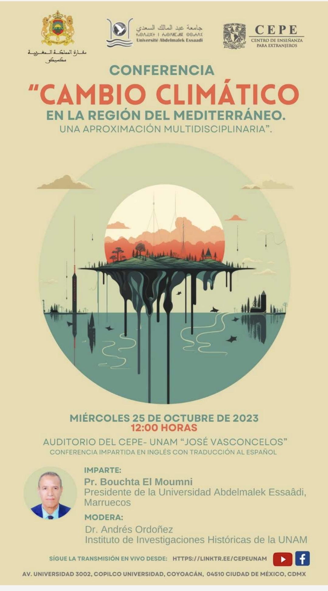 يلقي البروفيسور، بوشتى المومني، رئيس جامعة عبد المالك السعدي، اليوم الأربعاء 25 أكتوبر الجاري، ابتداء من الساعة 12.00 محاضرة علمية دولية حول :” التغير المناخي في حوض المتوسط” بمركز الدراسات والأبحاث التاريخية في مكسيكو.