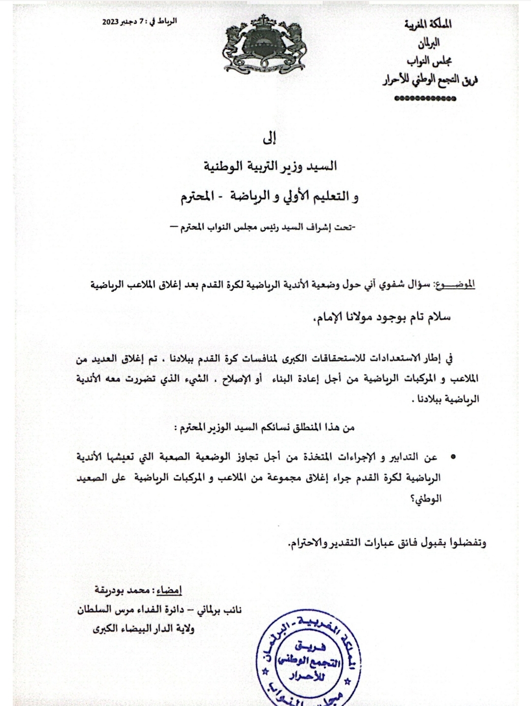 وجه محمد بودريقة رئيس فريق الرجاء الرياضي لكرة القدم، والنائب البرلماني عن حزب التجمع الوطني للأحرار، سؤالا شفويا إلى وزير التربية الوطنية والتعليم الأولي والرياضة شكيب بنموسى، حول وضعية الأندية المغربية بعد إغلاق بعض الملاعب.