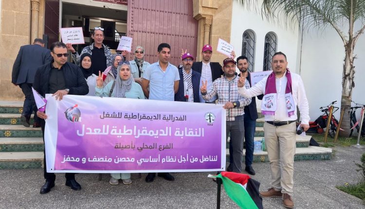 تفعيلا للبرنامج الإحتجاجي التصعيدي للنقابة الديمقراطية للعدل، جسدت هيئة كتابة الضبط بالمحكمة الإبتدائية بأصيلة بنسائها ورجالها ومناضلاتها ومناضليها وقفة احتجاجية أمام باب المحكمة بذات المدينة صباح اليوم الأربعاء 17 أبريل 2024 وذلك دفاعا عن حقوقهم العادلة و مطالبهم المشروعة تحت شعار مركزي : لا تنازل عن نظام أساسي محصن ومنصف ومحفز لكل موظفات و موظفي هيئة كتابة الضبط وفق ما سبق الإعلان عنه في بلاغ المكتب الوطني للنقابة الديمقراطية للعدل بتاريخ 15 مارس 2024 .