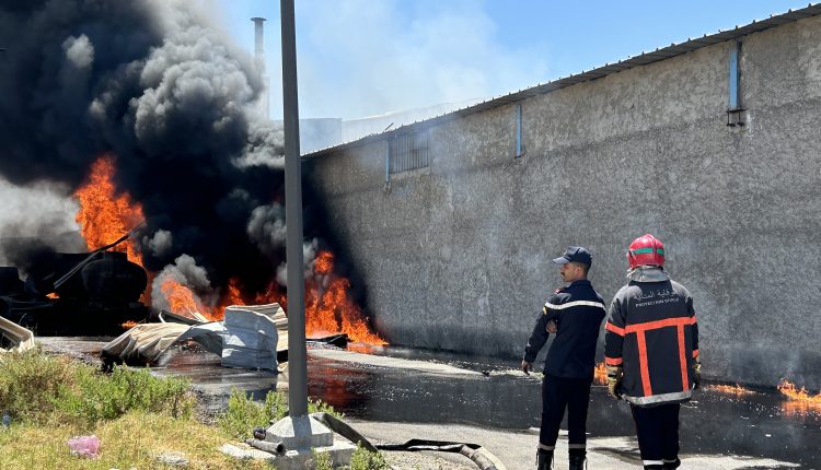 طنجة.. حريق مهول بالمنطقة الصناعية مغوغة بعد انفجار شاحنة “فيول” -فيديو-