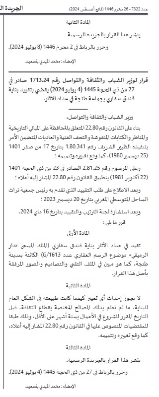 بقرار لوزير الشباب والثقافة والتواصل رقم 1713.24 بتاريخ 4 يوليوز 2024 الصادر بالجريدة الرسمية تحت عدد 7322 بتاريخ 1 غشت 2024، تم تقييد بناية فندق سفاري او دار الرميقي الكائن بشارع هولاندا بطنجة في عداد الآثار.
