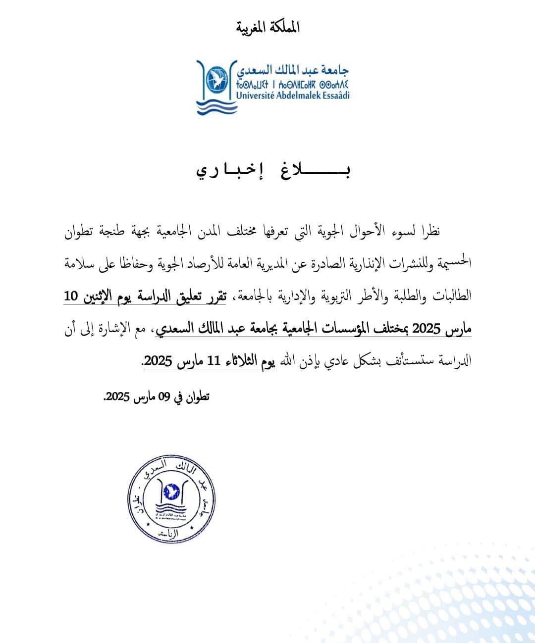 أعلنت جامعة عبد المالك السعدي عن تعليق الدراسة في كافة المؤسسات التابعة لها بجهة طنجة تطوان الحسيمة، يومه الإثنين 8 مارس.