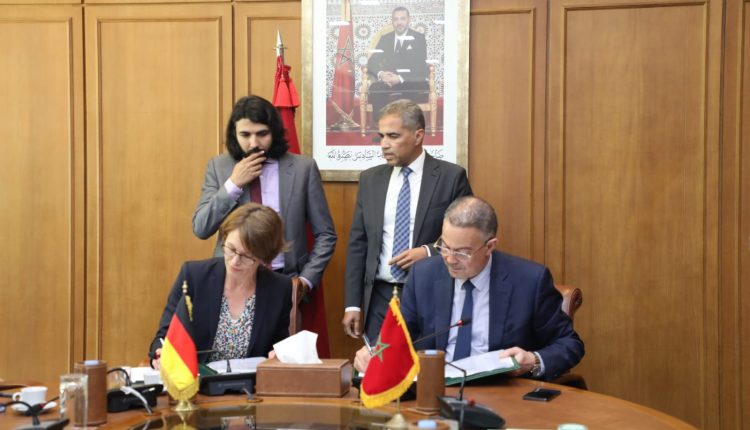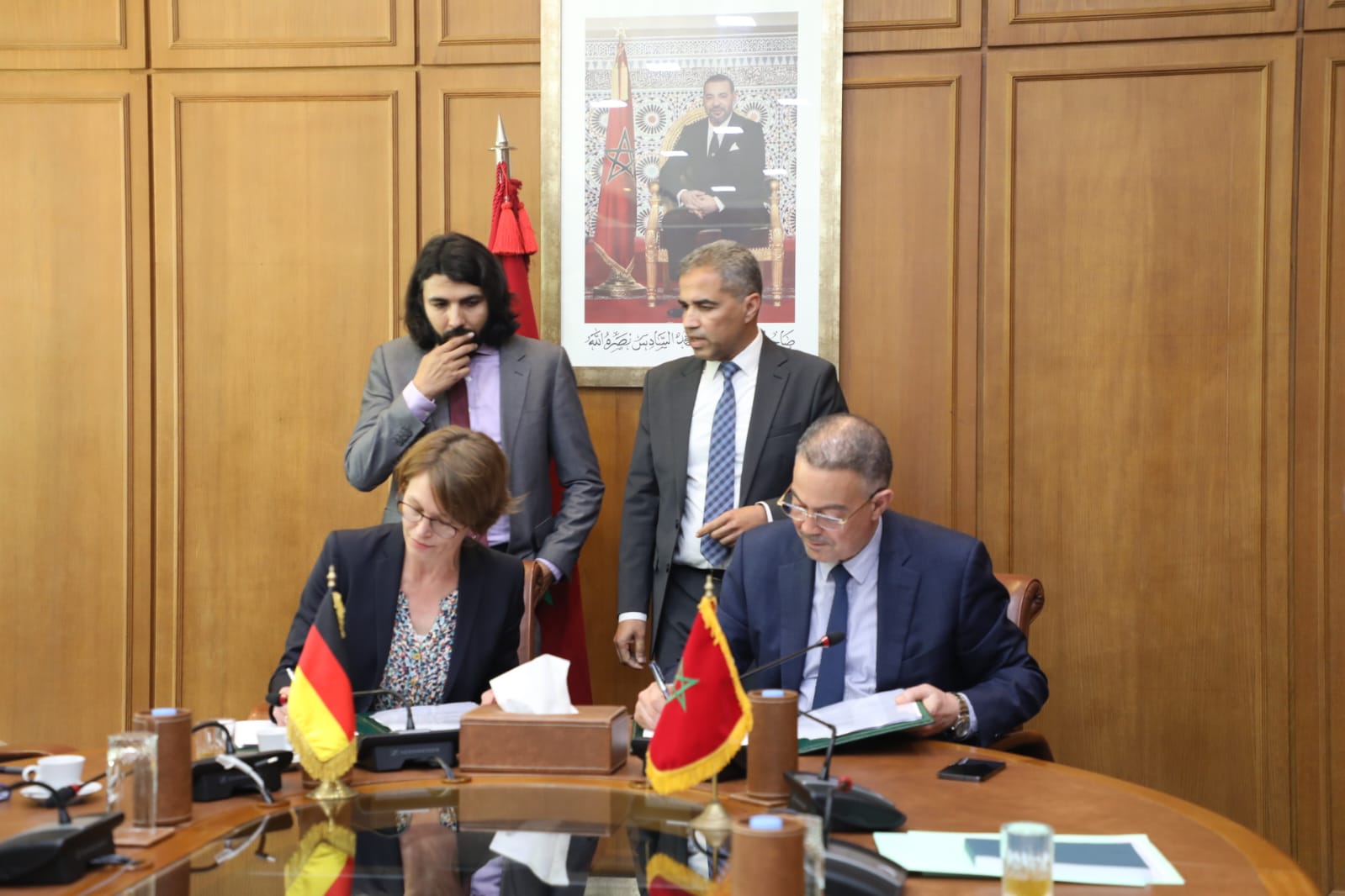 أشرف السيد فوزي لقجع، الوزير المنتدب المكلف بالميزانية، والسيدة ساندرا روهلدر، رئيسة قسم بالبنك الألماني للتنمية (KfW)، يوم 5 يونيو 2024، بمقر وزارة الاقتصاد والمالية، بحضور سعادة سفير ألمانيا بالمغرب، السيد روبرت دولغر، على توقيع عقد قرض بقيمة 100 مليون يورو، لدعم برنامج إعادة الإعمار والتأهيل للمناطق المتضررة من زلزال الحوز.