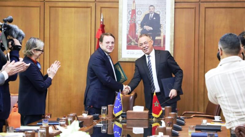 قام السيد فوزي لقجع، الوزير المنتدب المكلف بالميزانية والسيد أوليفر فاريهلي، المفوض الأوروبي للجوار والتوسع، بتاريخ 25 نوفمبر 2024، على الساعة 15:00 بتوقيع اتفاقية تمويل البرنامج المندمج لإعادة إعمار وتأهيل المناطق المتضررة من الزلزال (2024-2028) بمبلغ قدره 190 مليون يورو (حوالي 2.052 مليار درهم)، حيث سيتم صرف الدفعة الأولى التي تبلغ 100 مليون يورو هذا العام. يهدف هذا التمويل إلى دعم جهود إعادة الإعمار في المناطق المتضررة من زلزال 8 سبتمبر 2023