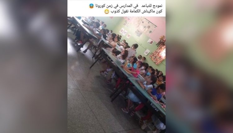 حملة تلميع الصور وبيع الوهم، التي انخرطت فيها وزارة التعليم، ما فتئت أن تحطمت بعد طفو صورة على صفحات مواقع التواصل تظهرقسما “نموذجيا” آخر، يجلس فيه تلاث تلاميذ في الطاولة. البعض شكك في الصورة، بينما البعض الآخر جزم في صحتها. حيث أنالأطفال الصغار في الصورة يلبسون الكمامات “الواقية” من كورونا.