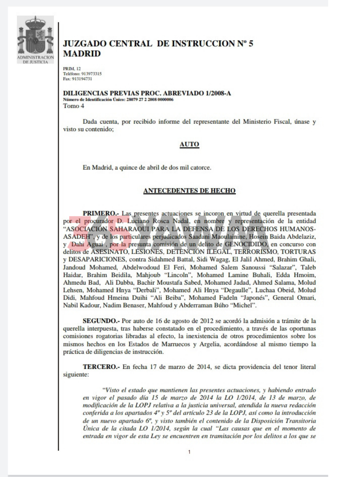دخل الضابط الاسباني لقسم وحدة ” ICU ” بمستشفى لاريوخا ،لزيارة إبراهيم المريض و استكمال باقي الإجراءات ، حيث أخبره،بأنه مطلوب من طرف قاضي المحكمة الوطنية للاستماع إليه،بخصوص عدة شكايات تقدم بها ضده مواطنون إسبان، تم تعذيبهم و تشريد أسرهم في منطقة” تندوف”، وحالة اغتصاب واحدة.